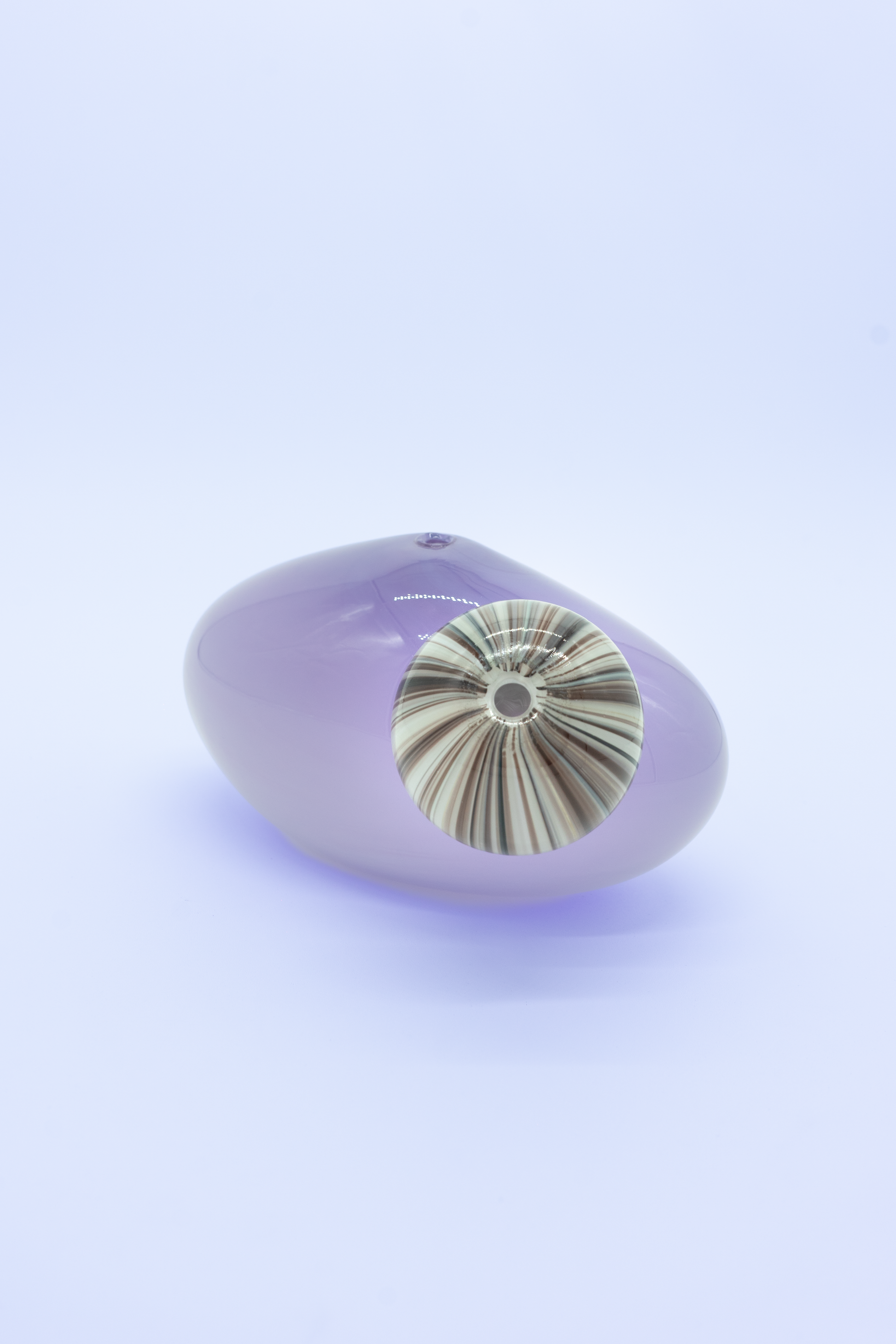 Erizo Pocket es una pequeña escultura de vidrio soplado inspirada en los erizos de mar y en las formas orgánicas del fondo oceánico. Su cuerpo morado, suave y alargado, contrasta con el detalle central tipo erizo trabajado con finas líneas que parecen expandirse desde un punto de luz, creando un efecto hipnótico y táctil.